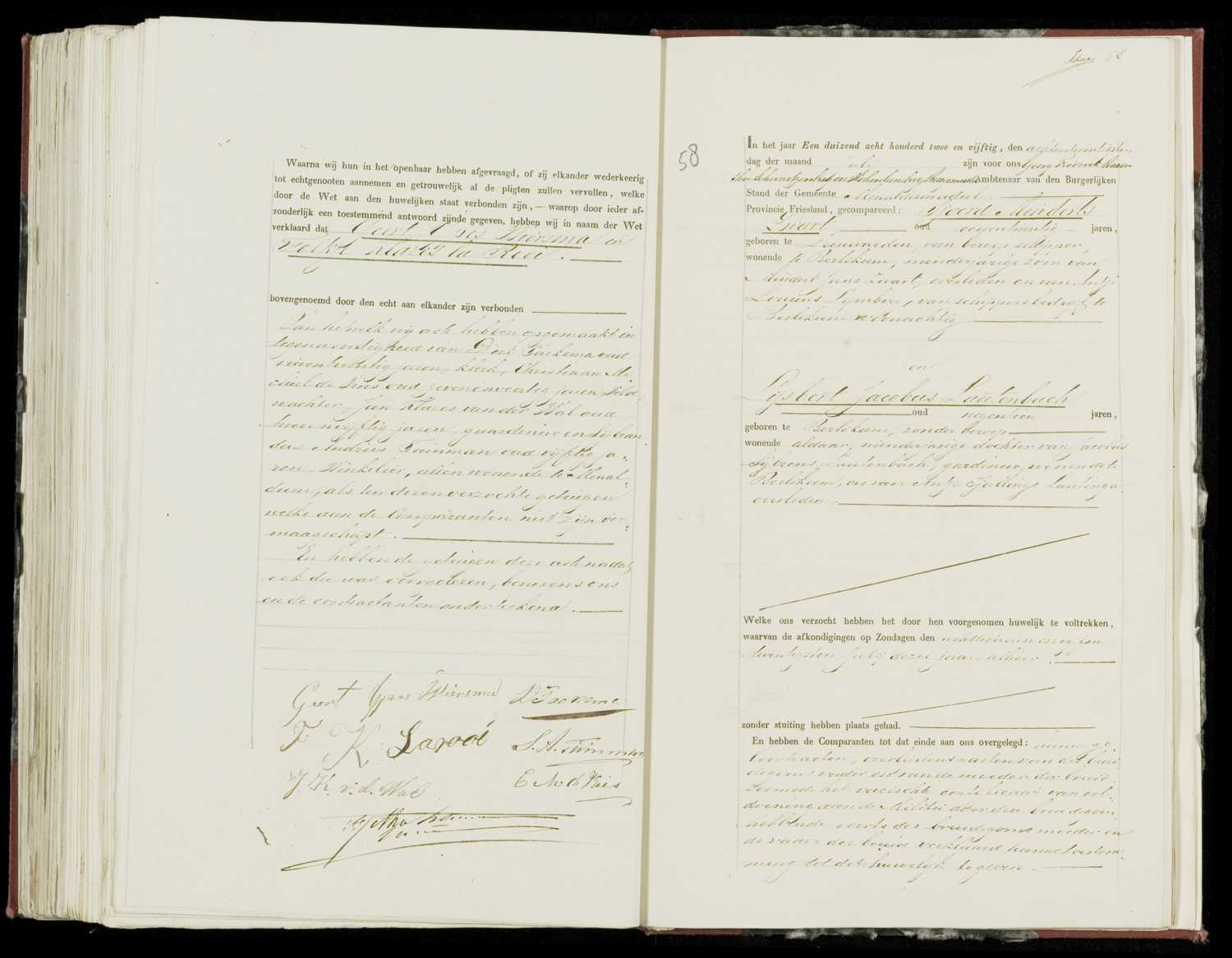 Huwelijksregister 1852, archiefnummer 30-25, Burgerlijke Stand Menaldumadeel - Tresoar, inventarisnummer 2016, aktenummer 058