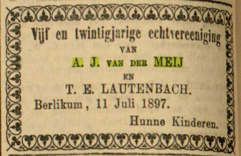 "Familiebericht". "Leeuwarder courant". Leeuwarden, 09-07-1897. Geraadpleegd op Delpher op 03-11-2016, http://resolver.kb.nl/resolve?urn=ddd:010594897:mpeg21:a0045