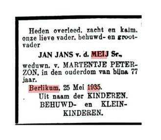 Jan Jans VAN DER MEIJ {M} [P27] = Martentje Sjoerds PETERZON22 {V} [P1071] > Familie [F402]