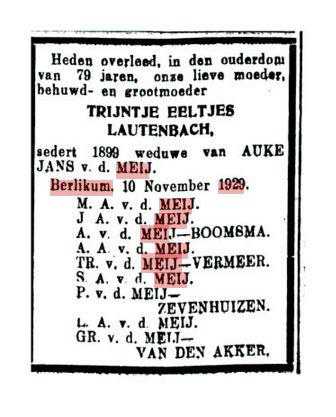 "Familiebericht". "Leeuwarder courant". Leeuwarden, 14-11-1929. Geraadpleegd op Delpher op 04-11-2016, http://resolver.kb.nl/resolve?urn=ddd:010604768:mpeg21:a0127