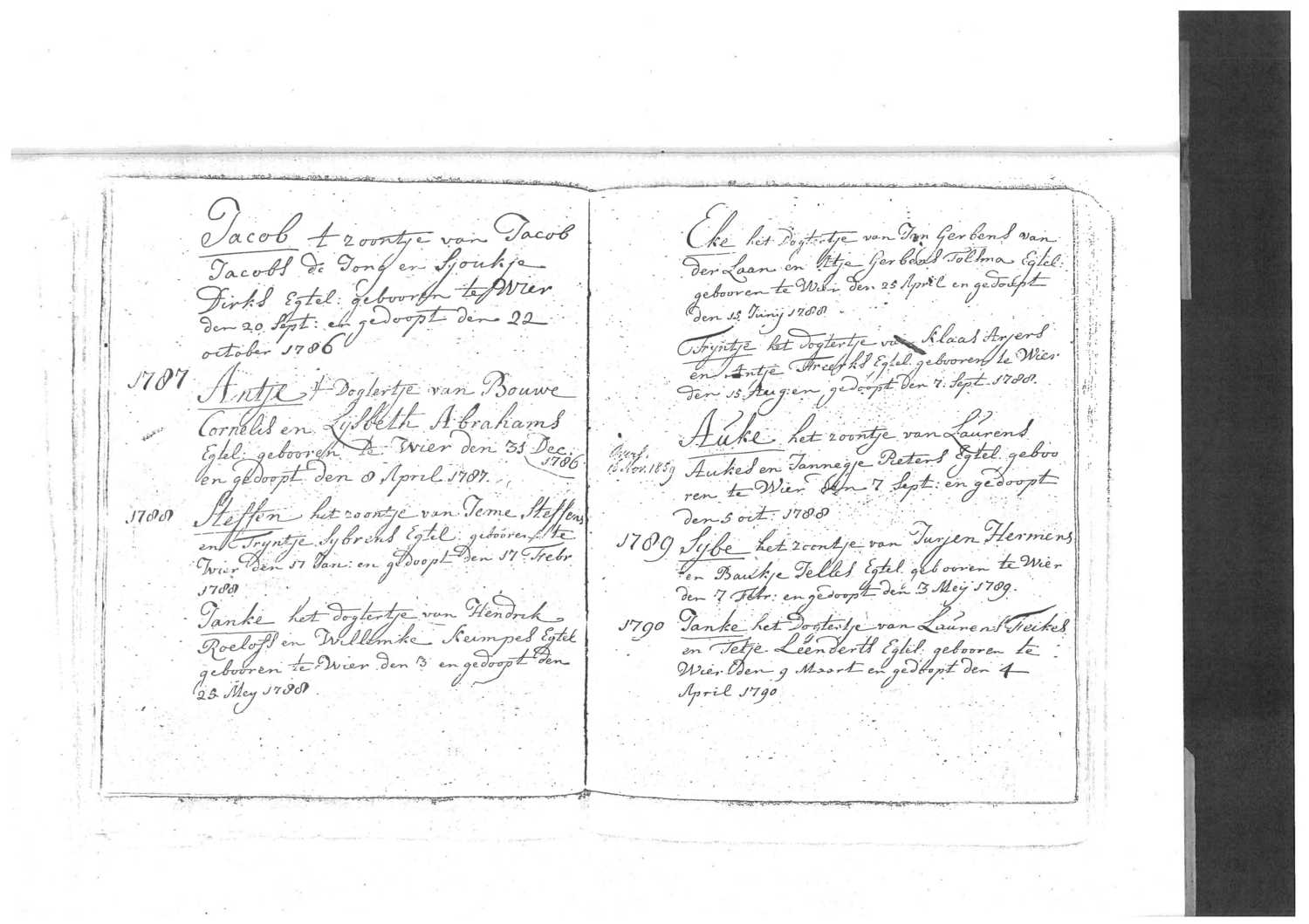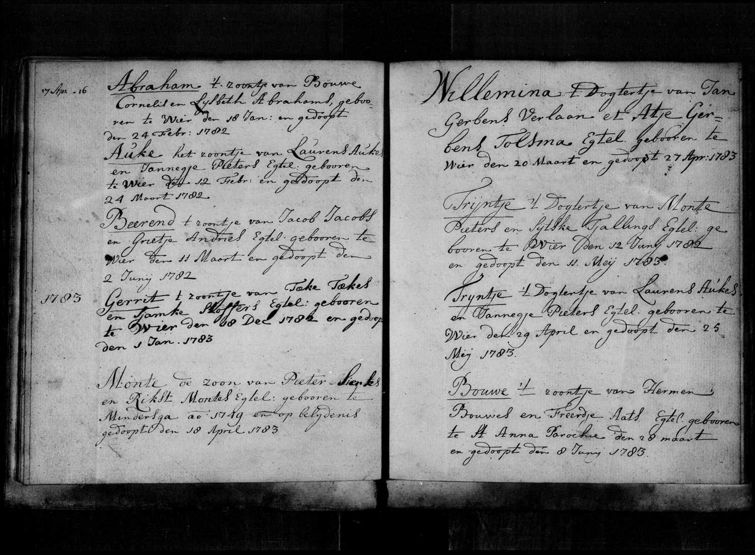 Bron: DTB Dopen Soort registratie: DTB inschrijving doop Aktedatum: 16-10-1785 Plaats: Wier