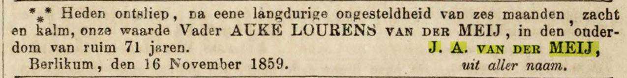 "Familiebericht". "Leeuwarder courant". Leeuwarden, 02-12-1859. Geraadpleegd op Delpher op 03-11-2016, http://resolver.kb.nl/resolve?urn=ddd:010584835:mpeg21:a0061