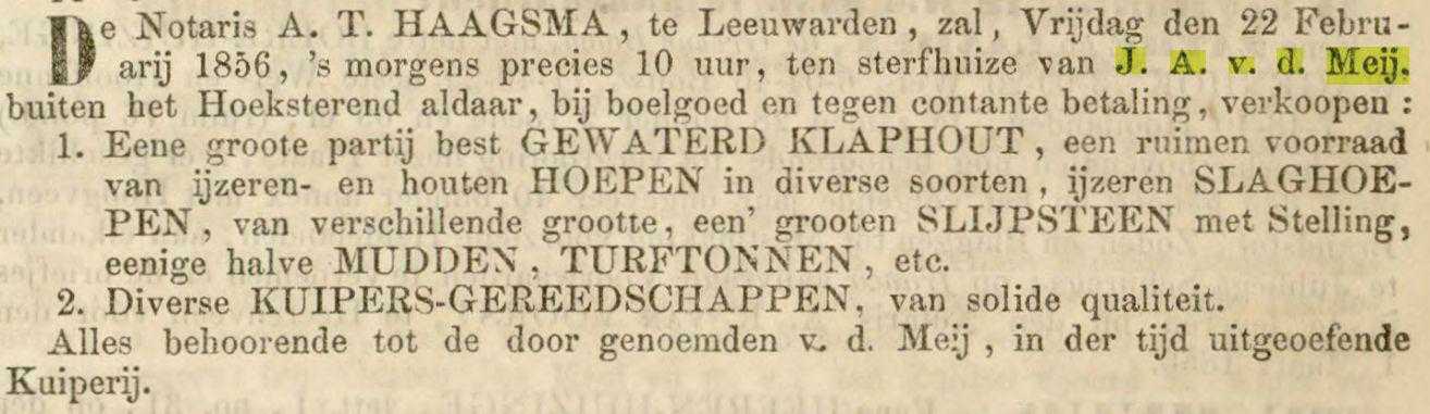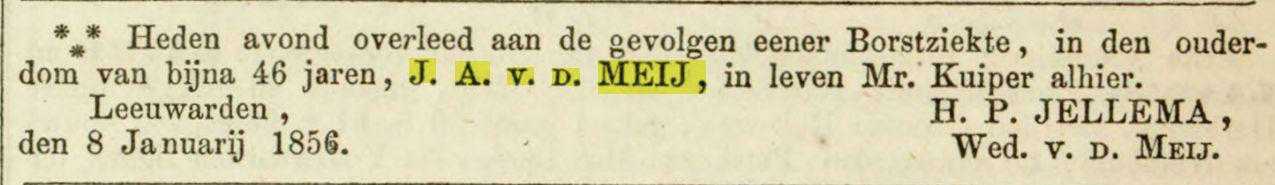 "Familiebericht". "Leeuwarder courant". Leeuwarden, 11-01-1856. Geraadpleegd op Delpher op 04-11-2016, http://resolver.kb.nl/resolve?urn=ddd:010584432:mpeg21:a0045