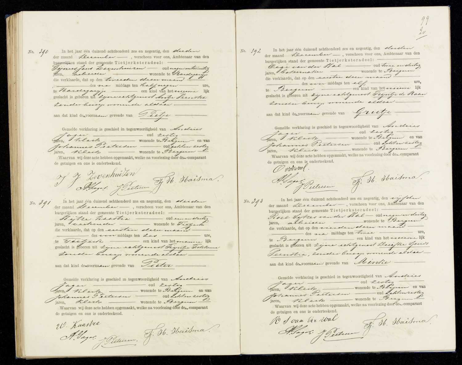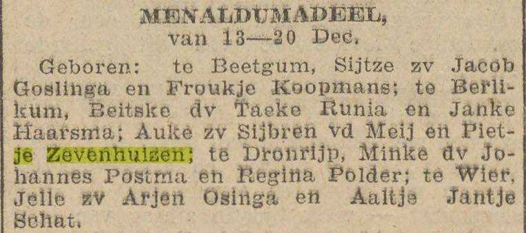 Geboorteregister 1896, Tietjerksteradeel, Aktenummer A390, Pietje Zevenhuizen