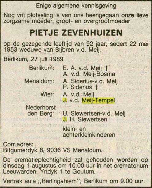 "Familiebericht". "Leeuwarder courant : hoofdblad van Friesland". Leeuwarden, 28-07-1989. Geraadpleegd op Delpher op 04-11-2016, http://resolver.kb.nl/resolve?urn=ddd:010567020:mpeg21:a0253