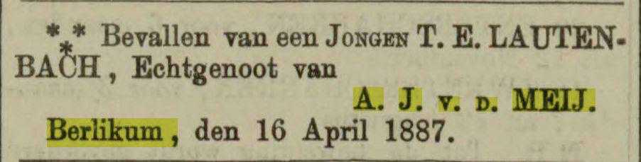 "Familiebericht". "Leeuwarder courant". Leeuwarden, 19-04-1887. Geraadpleegd op Delpher op 05-11-2016, http://resolver.kb.nl/resolve?urn=ddd:010589741:mpeg21:a0052