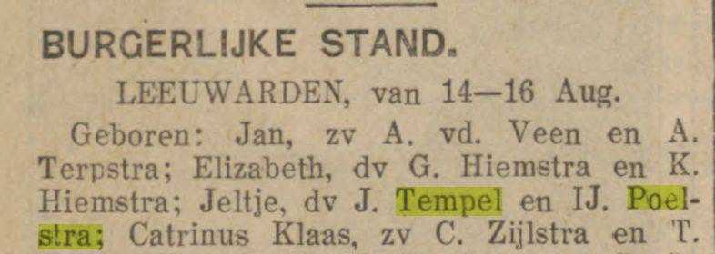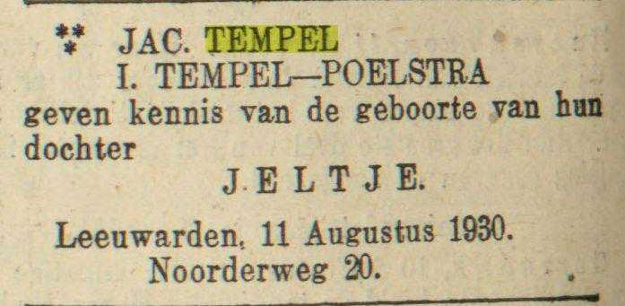 "Familiebericht". "Leeuwarder nieuwsblad : goedkoop advertentieblad". Leeuwarden, 16-08-1930. http://resolver.kb.nl/resolve?urn=ddd:010746236:mpeg21:a0045