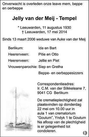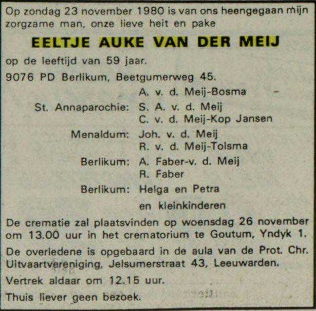 Overlijdensadvertentie Eeltje Auke van der Meij