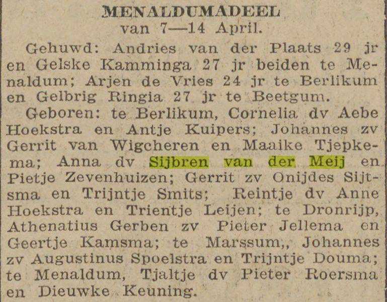 "Familiebericht". "Nieuwsblad van Friesland : Hepkema's courant". Heerenveen, 21-04-1925. Geraadpleegd op Delpher op 30-11-2015, http://resolver.kb.nl/resolve?urn=ddd:010734311:mpeg21:a0091