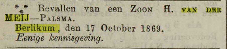 "Familiebericht". "Leeuwarder courant". Leeuwarden, 29-10-1869. Geraadpleegd op Delpher op 03-11-2016, http://resolver.kb.nl/resolve?urn=ddd:010585876:mpeg21:a0081