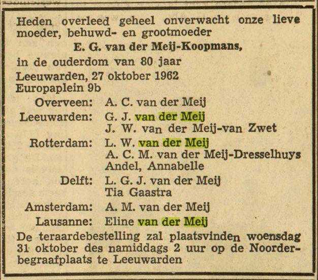 "Familiebericht". "Leeuwarder courant : hoofdblad van Friesland". Leeuwarden, 29-10-1962. http://resolver.kb.nl/resolve?urn=ddd:010616378:mpeg21:a0180