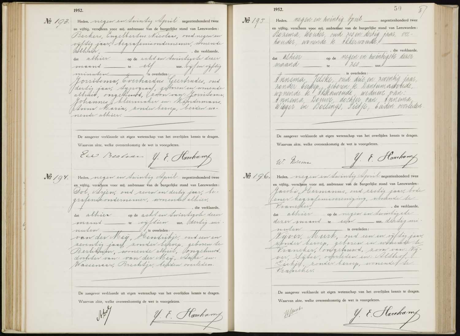 Bron: Burgerlijke standregister Soort registratie: Overlijdensakte Datum: 28-04-1952 Plaats: Leeuwarden Soort akte: Overlijdensakte