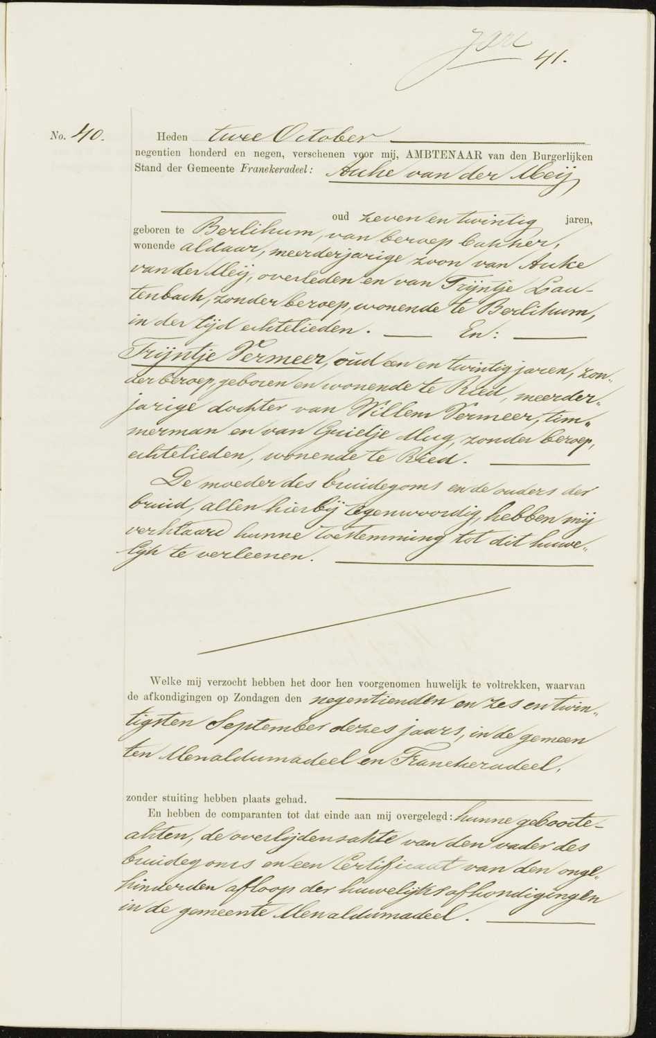 Huwelijksregister 1909, Franekeradeel, Aktenummer A40, Auke van der Mey