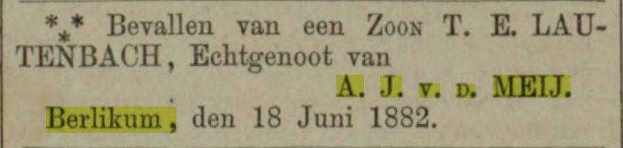 "Familiebericht". "Leeuwarder courant". Leeuwarden, 23-06-1882. Geraadpleegd op Delpher op 05-11-2016, http://resolver.kb.nl/resolve?urn=ddd:010588257:mpeg21:a0076