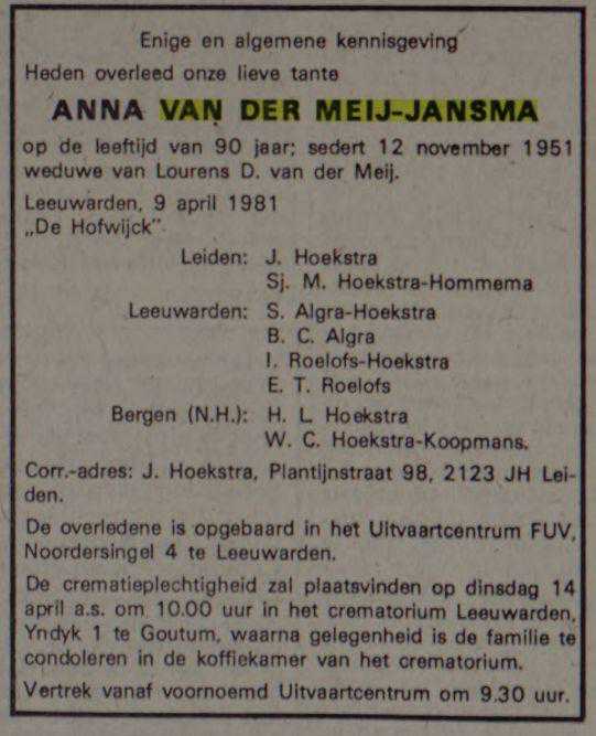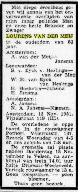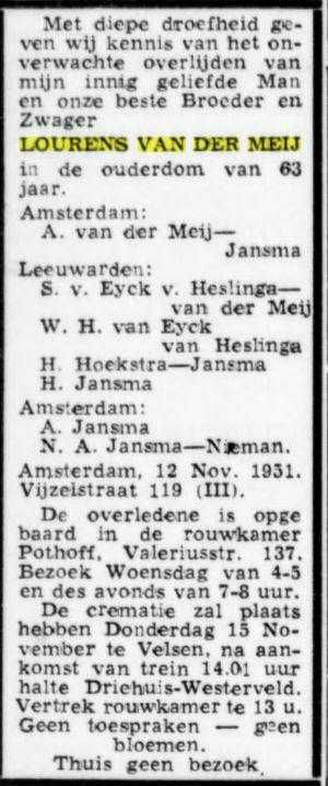 "Begrafenis D.L. van der Meij.". "Leeuwarder courant". Leeuwarden, 20-04-1929. Geraadpleegd op Delpher op 02-11-2016, http://resolver.kb.nl/resolve?urn=ddd:010604593:mpeg21:a0018