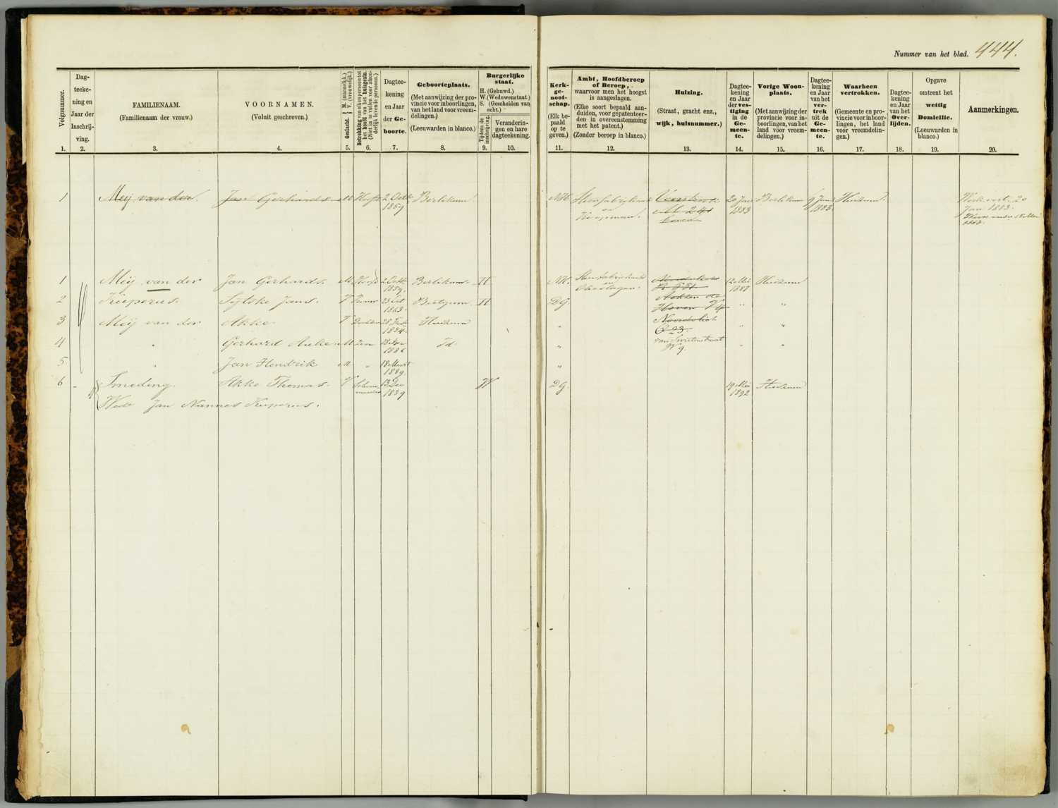 Bevolkingsregister 1876 - 1904, Leeuwarden, Paginanummer B444, Gerhard Auke en Jan Hendrik van der Meij