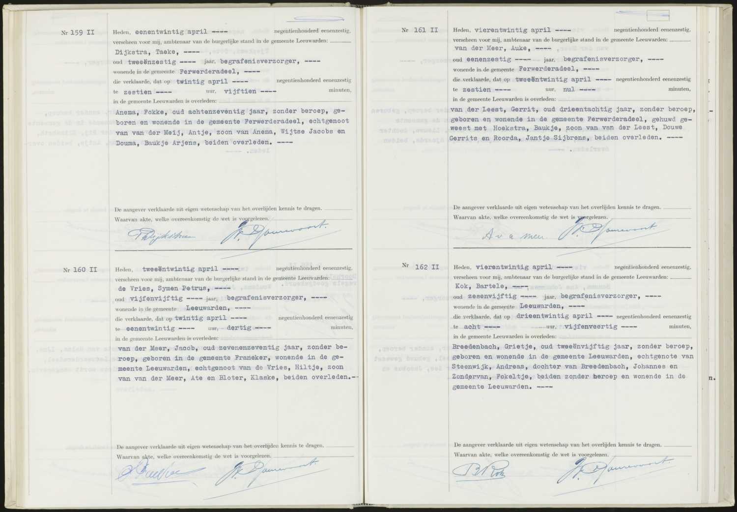 Bron: Burgerlijke standregister Soort registratie: Overlijdensakte Datum: 20-04-1961 Plaats: Leeuwarden Soort akte: Overlijdensakte