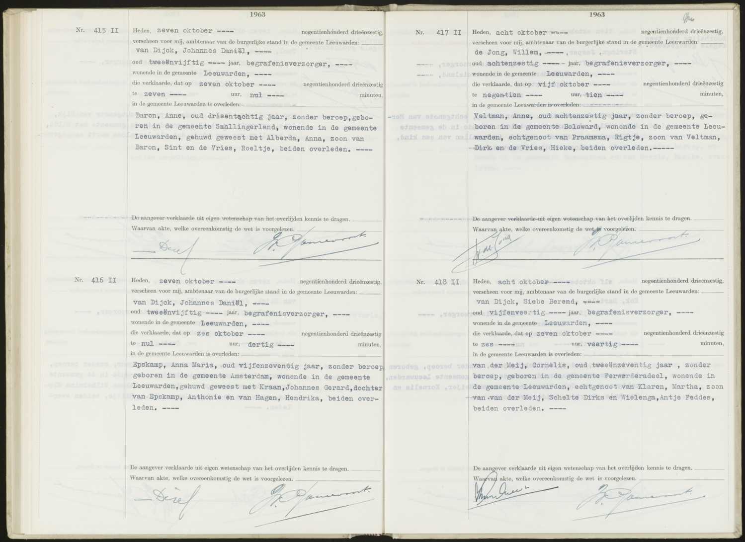 Overlijdensregister 1963 II, archiefnummer 1003, Gemeentebestuur van Leeuwarden, 1942-1971 - Historisch Centrum Leeuwarden, inventarisnummer 5529, aktenummer 0418 II