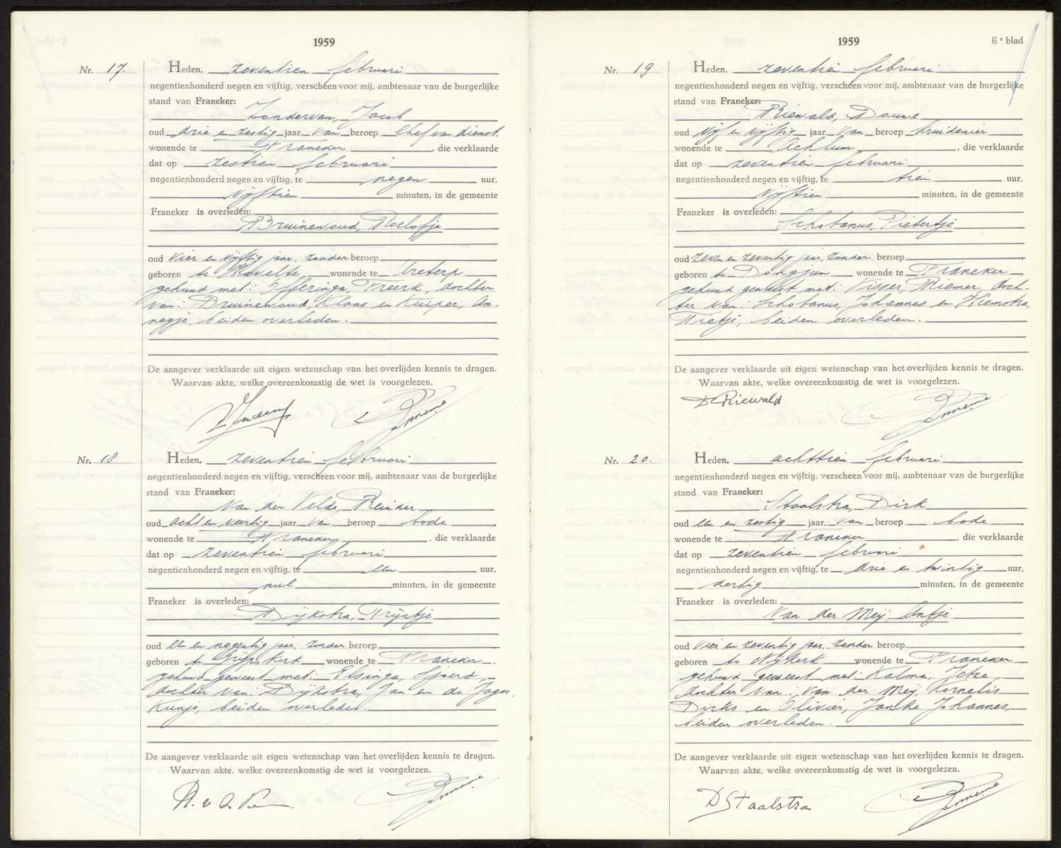 Overlijdensregister 1959, archiefnummer 30-12, Burgerlijke Stand Franeker - Tresoar, inventarisnummer 3091, aktenummer 0020