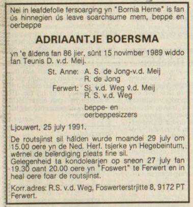 "Familiebericht". "Leeuwarder courant : hoofdblad van Friesland". Leeuwarden, 26-07-1991. http://resolver.kb.nl/resolve?urn=ddd:010567630:mpeg21:a0232