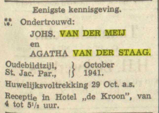 "Familiebericht". "Leeuwarder courant". Leeuwarden, 1941/10/25 00:00:00, p. 7. http://resolver.kb.nl/resolve?urn=ddd:010608413:mpeg21:p007