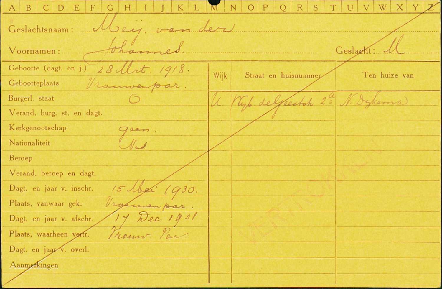 Bevolkingsregister 1922 - 1939, Leeuwarden, Johannes van der Meij
