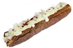 A frikandel is a deep-fried, skinless, cylindrical sausage-like snack popular in the Netherlands, made from a mixture of minced meat (typically pork and chicken), spices, and breadcrumbs. It is commonly served hot with mayonnaise, curry ketchup, and diced onions, with the most popular variation being the "frikandel speciaal," which has these toppings in a slit in the sausage.